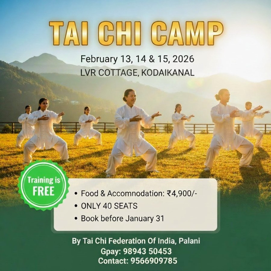 The Tai Chi Federation of India, Palani, successfully organized its annual training camp in Kodaikanal from February 13th to 15th, 2026. More than 40 enthusiasts from major cities including Chennai, Bengaluru, Coimbatore, and Madurai participated in this training session.This camp once again reaffirmed that such practices are essential for people living mechanized, fast-paced lives in metropolitan cities like Chennai and Bengaluru.The event concluded on a high note with certificates being distributed to all participants. The primary objective of this federation is to promote and spread the art of Tai Chi across the whole of India.
